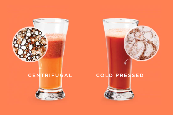 Kuvings cold pressed technology ensures juice with condensed particles, staying naturally fresher for longer due to the slow rotating screw that tightly squeezes the fruit/veg. This process gently extracts juice and separates the fibre. Centrifugal juicers operate at high speed, which causes nutrients to deteriorate and particles to separate quicker.