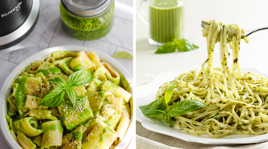 Roast the pine nuts for 1-2 minutes on a pan until they just turn brownish. Use the chopper/grinding blade for a roughly textured pesto, or the blending blade for a smoother texture. Add all ingredients to the small (300ml) jar and blend for 10 seconds or until smooth. Serve with your favourite pasta dish or as a topping on your toast! Garnish with extra basil leaves for display. Store left-over pesto in an air-tight container.