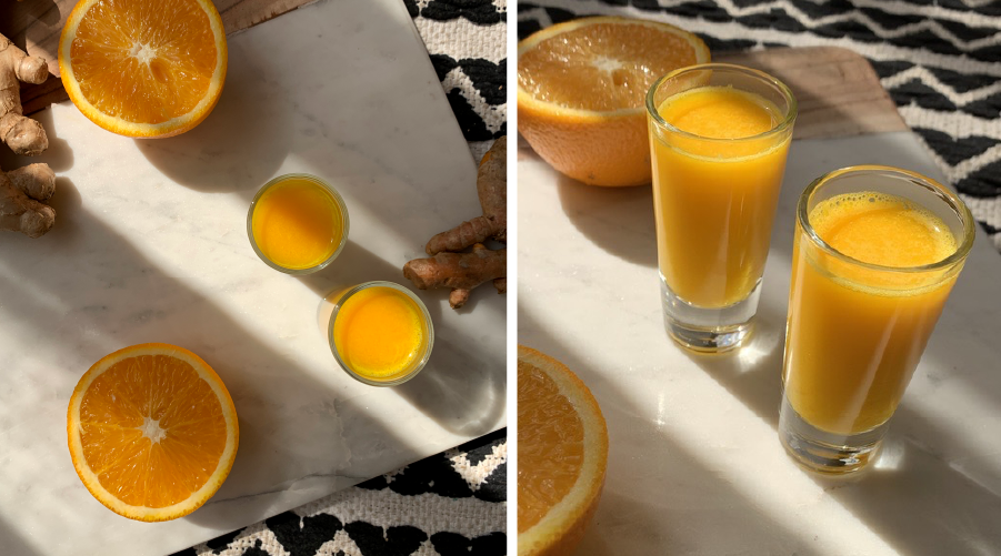 Cut the ginger in 2 cm pieces. Feed all ingredients slowly, one by one through your Kuvings Whole Slow Juicer. Allow it to mix in the juicing bowl before opening the smart cap. Once mixed well, open the cap. Pour in your shot glass. Drink immediately for the most health benefits!