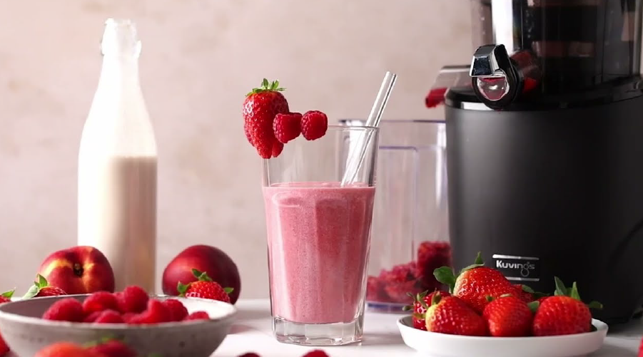 Soak the almonds in water overnight. Drain them, and put them in the slow juicer, alternating with the water. The result is delicious, creamy almond milk. Add water to your liking if it’s too creamy. Put the strawberries and raspberries in the juicer and mix everything together. A delicious shake is created. This can be served with ice cubes in summer for a wonderful refreshing shake!